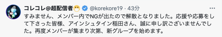 重大発表があると言っていたコレコレさんが、何とメンバー内の不和を理由に解散を発表。新メンバーをまた集めると9日深夜にポストをしています。