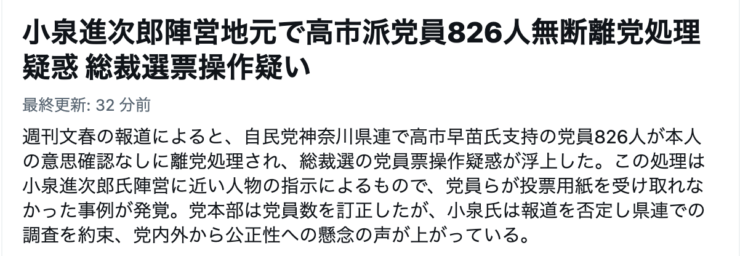 本件は、一部メディアが「党員の意思確認がない離党処理が多数あった」と報じたことに端を発します。報道は、総裁選の投票用紙が届かない事例が出た点を問題視し、県連の手続きの妥当性に疑問を投げかけています。