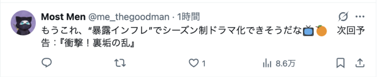 一方でXでは「暴露インフレ」というユーモラスな表現が飛び交い、重苦しい暴露騒動を“エンタメ化”する動きも広がっている。