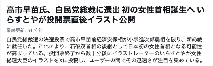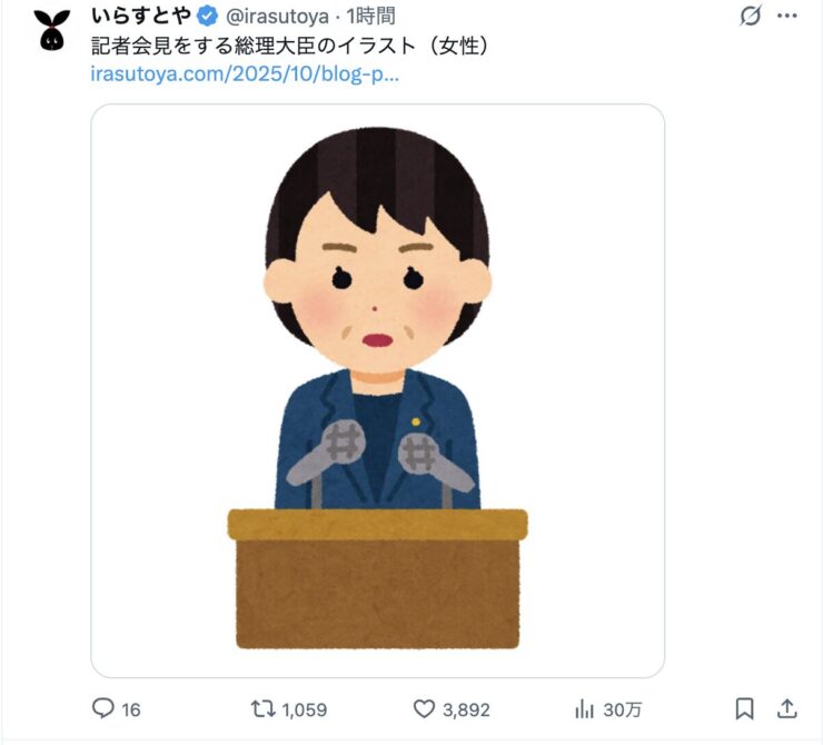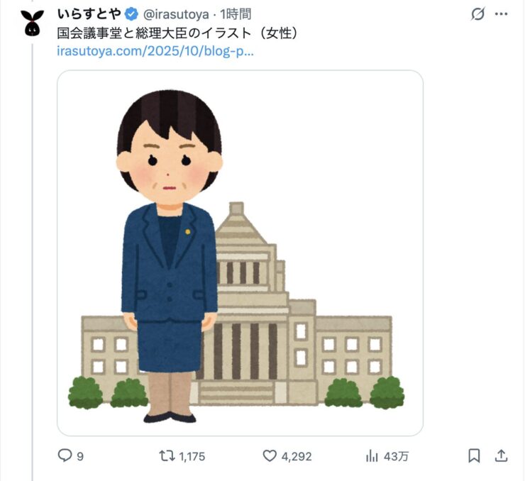 そのニュースが流れてからわずか数十分後、いらすとやが「女性の総理大臣」の新イラストをX(旧Twitter)に投稿したのだ。