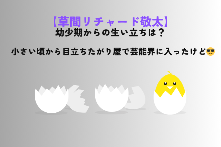 草間リチャード敬太さんは幼いころから周囲を笑わせたり、人前に出ることが好きな子どもでした。テレビを観ては「自分もあの舞台に立ちたい」と夢を抱くようになり、小学6年の頃に芽生えた憧れはやがて現実になります。小さな頃の好奇心や承認欲求が、そのまま大人になっても原動力として続いている点が印象的です。