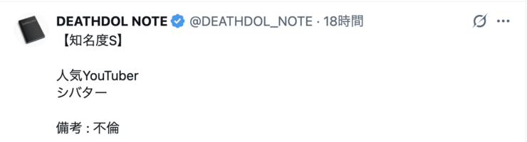 この投稿は数時間で1万件を超える「いいね」を獲得し、関連ワードの「シバター不倫」「DEATHDOL NOTE」「Sランク」が同時にトレンド入りし、まとめサイトやネットメディアでも大きく取り上げられた。しかし、投稿には決定的な証拠がなく、また本人からの釈明も出ていないため、現時点では疑惑の域を出ていない。