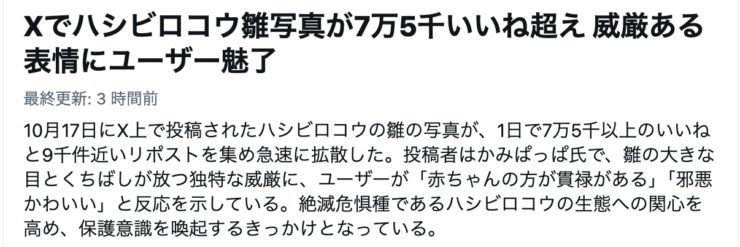 X(旧Twitter)で投稿されたハシビロコウ親子の写真が、わずか数時間で20万件を超える「いいね」を獲得。「威厳ありすぎ」「もはや赤ちゃんの方が怖い」などのコメントが殺到している。投稿のあまりの完成度から「AI生成では?」という声も上がる中、ネットでは“本物の迫力”をめぐる議論が盛り上がっている。