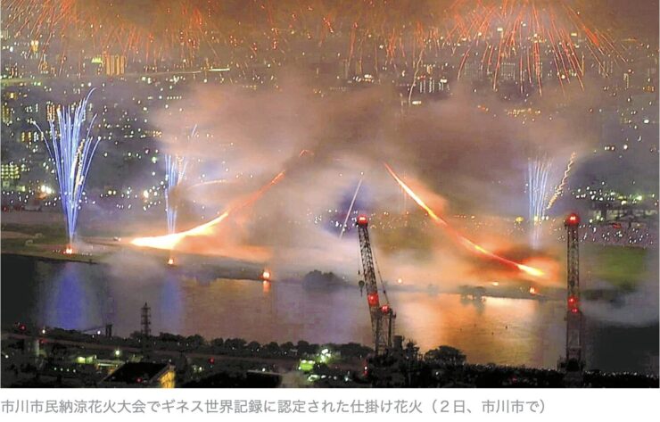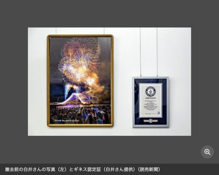2025年8月、千葉県市川市の花火大会で「最も高い山型の仕掛け花火」がギネス世界記録に認定された。市はそのギネス認定証とともに、撮影を担当した写真家・白井俊一郎さんの花火写真を市役所に展示。白井さんは市の依頼でボランティア撮影し、無償で提供していた。