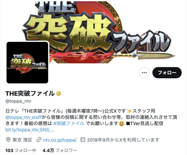 だが、『THE突破ファイル』の公式アカウントのプロフィールには、