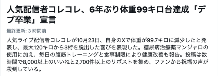 - コレコレさんの場合「99.7kg」という報告がひとつの節目となり、100kgを超えていた→99kg台に“躍り出た”ことがトピック化。