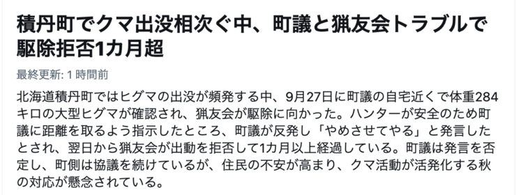 積丹町では現在、町議本人への聞き取り・猟友会との協議・安全確保の代替体制の検討を進めているはずです。ただ、秋はヒグマの活動期。対応が遅れれば町民の安全が脅かされかねません。