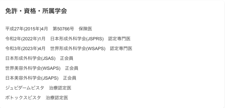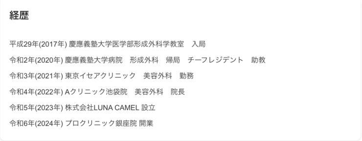 - 経歴: 慶應の形成外科でトレーニングを積んだ「形成外科専門医」
