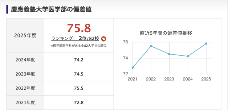 慶應義塾大学医学部の偏差値は、年度によって若干の差はありますが、おおむね**「72.8」〜「75.8」**の範囲にあります。
